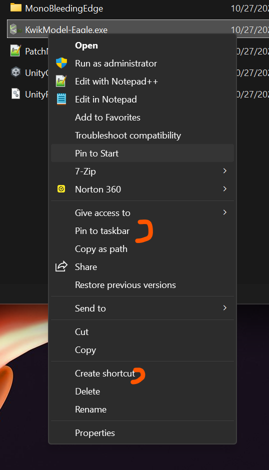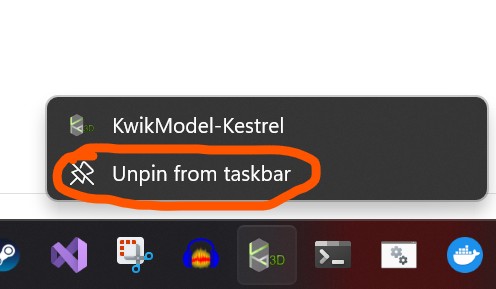 -Right click on the KwikModel.exe file to pin it (under “show more options”>“Pin to taskbar”). Or if the program is already open, you can instead right click on the Kwik Model icon on the Windows taskbar to pin/unpin it. (lower image below)